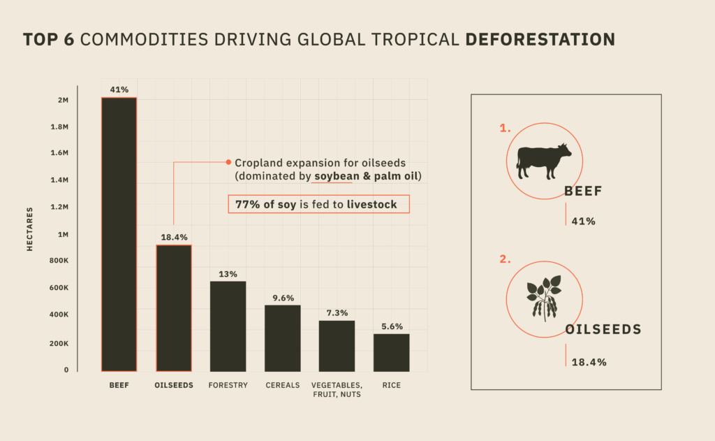 While industrial-scale beef production is the number one driver of global tropical deforestation, oilseeds such as soy and palm oil are a significant area of concern.