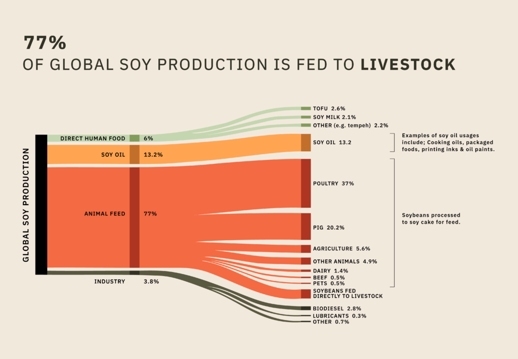 Similarly opaque to the general public is what’s really driving the demand for soy. It turns out that humans’ direct consumption of soy is relatively small, accounting for less than 6% of total demand. The overwhelming majority of soy is fed to the animals we raise as livestock; animals such as chickens, pigs and cattle.