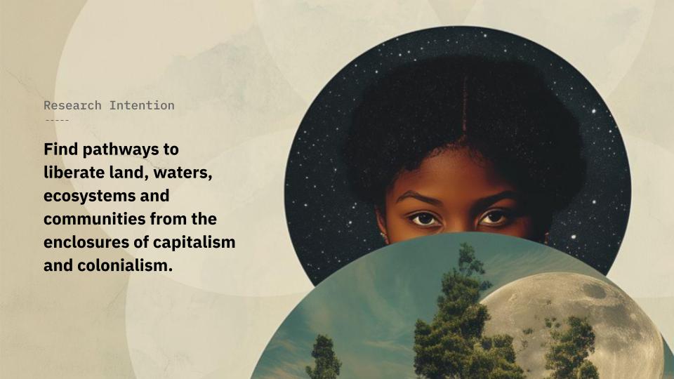This research sets out with the intention of finding pathways to liberate land, waters, ecosystems, and communities from the enclosures of capitalism and colonialism. Beyond the carbon-centered approaches to the climate crisis limited by reductionist metrics and market-driven solutions are alternate pathways already embodied by living examples. These pathways —rooted in justice, solidarity, community stewardship, regenerative economies, and shifts towards more ecological consciousness—when interwoven, can serve as a navigational tool for systems change.