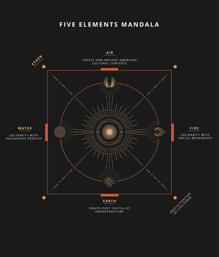 In other words, we view the healing of and liberation of wealth itself as a transition pathway. We offer the five element mandala as a coordinate set of possibilities or transition pathways. Indigenous peoples represent the element of Water, the tributaries and veins of the planet, stewarding the world’s biodiversity. Social movements led by the global majority are the Fire element that forge the pathways towards life-centric alternatives through direct experience and place-based wisdom. The Air element is where new-ancient-emerging post capitalist cultures are re-imagining and reconstituting the oxygen (i.e. ideas and consciousness) we breathe. Building post-capitalist infrastructure are the Earth element, ensuring food, land, water, energy, medicine and cultural sovereignty at local and bioregional levels. The (re)cultivation of life -force is held in the element of Ether; addressing the roots of the trauma culture of capitalist modernity and centring our relationship with life and death.